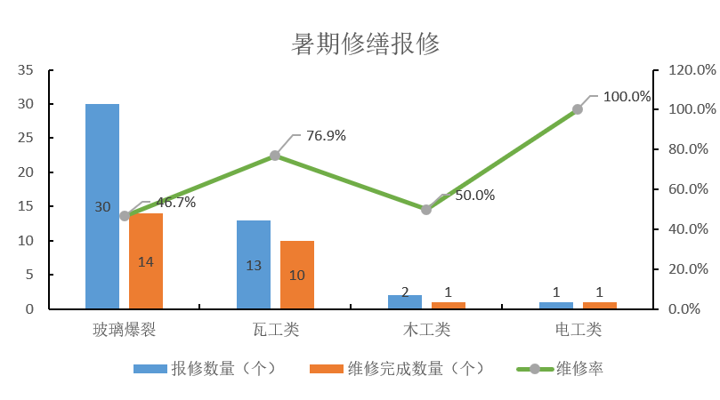 7-8月,由物业办申报修缮维修项目共计46条,其中玻璃爆裂项最多,包括30条。7-8月持续高温,与开着空调的屋内温度形成了明显温差,楼宇钢化玻璃爆裂破碎频发。由于钢化玻璃需要定制,且部分涉及到高空作业,维修难度大,目前修缮科已完成维修14条,剩余18条修缮科已接单,正在逐步维修中。